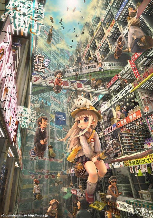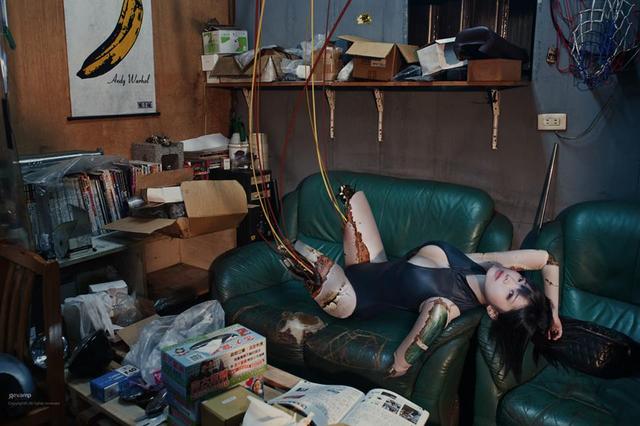 ▲ HEBE TIEN田馥甄-你就不要想起我You Better Not Think About Me / MV 暗色调斜线构图逆光 ▲ highrise /电影海报 橙色实现不可能逆光 ▲ 解构违反视觉经验 ▲ 机器少女壹号( 台湾ACG动漫主题摄影师─荒木Russell Yei ) 暗色调 违反视觉经验井字构图 ▲ 实现不可能引导线解构 1 三点透视 一般日常视角,垂直线几乎都是互相平行的,小幅度的低头、抬头也不会有明显变化,但当使用大幅度仰角或俯角拍摄时,垂直平行线就会变成很戏剧性的交集线(景物收缩),得到第三个消失点(仰视时第三个消失点在上方,俯视时则在下方),即三点透视,出动广角镜能让其变形更夸张。 ▲ 三个方向都有消失点会产生变形效果。