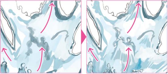 【整理水花的形状】 1、用[水彩]工具的[浓水彩]刷子从上王下涂上2~3种的蓝色,展现出立体感。