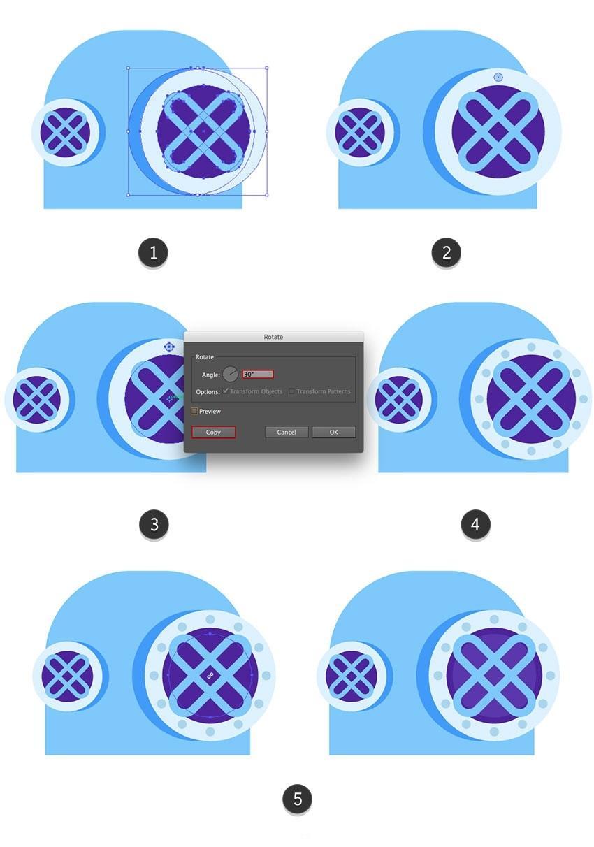 第2步 在头盔的右侧部分为潜水员的面板(1)创建一个更大的镜像副本。 在白板轮廓内形成一个小圆圈(#acd4ef),将其放置在顶部固件下方并与其中心对齐(2)。 选中圆圈,选择 旋转工具(R) ,然后 在面板中间按住Alt键单击。在“ 旋转” 面板中,将“ 角度”设置 为30° ,然后单击“ 复制” 按钮(3)。按 Control-D 重复上一个操作并继续按 Control-D 以在板(4)周围添加所有12个圆圈。 选择内紫色圆圈并在其前面创建一个较小的副本,将颜色更改为#5634b2(5)。