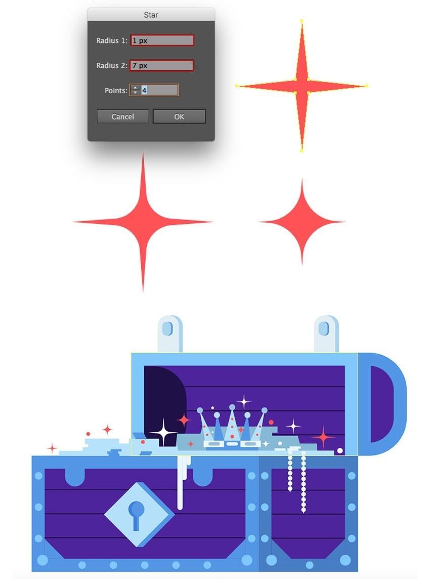 让我们的宝贝闪耀! 使用星形工具,在选项窗口中将 半径1设置 为1像素,半径2 到7像素,点数设置为4,创建一个四角星。 通过使用直接选择工具(A)选择并拖动它们来围绕星形的内角。制作一些不同大小和角半径的星星副本,并将副本分散到宝藏上。设置一些星星的颜色,并在星星中添加一些红色和白色的圆形闪光,营造出均衡的构图。 将(Control-G)所有宝箱对象组合在一起。
