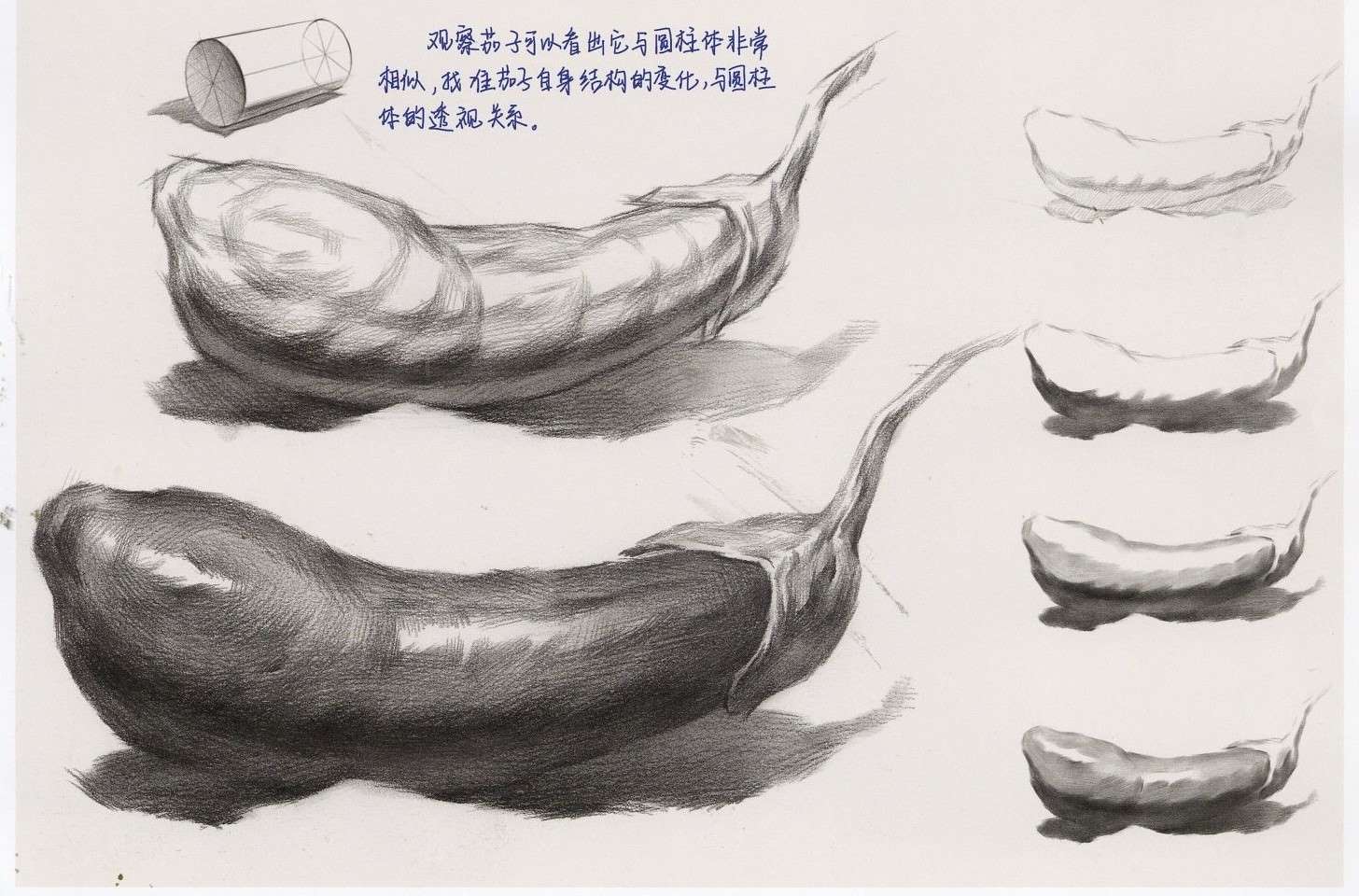 学习绘画素材是基本功,素描蔬菜想必大家都不陌生,比素描几何体要难一些。 西红柿的形体可以理解为简单的球体,打形时注意轮廓的方圆变化。用均匀的细线表现西红柿光滑圆润的效果,注意高光的形状,蒂部的体感,空间感也要表现出来。 |
