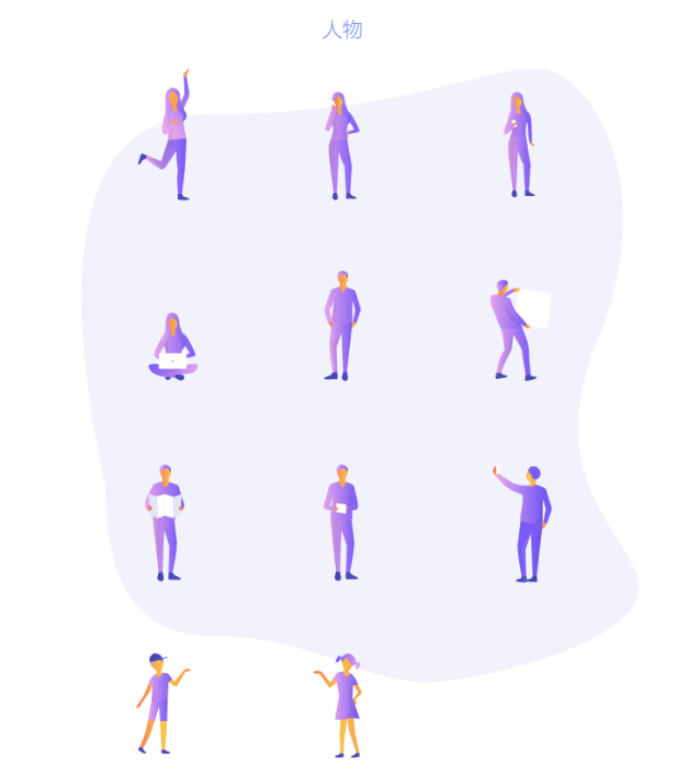 IRA是一款主打渐变风格的矢量插画素材网站,质量很高,完全免费可商用。支持在线更改5种渐变色彩,如果是人物素材,还可以分别改变头发和服装颜色,非常实用了~