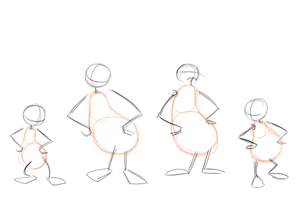 反相的梨形。“梨的规则”是否适用于所有从现在开始将创作的卡通人物? 不一定. 如果我们改变形状,就会给我们的角色创造出力量感! 像下面的例子。 另一些有趣的类比是基于跟角色相似的特殊物体外形,比如下面例子: 愚笨的角色“愚笨的角色”一般这样。两条腿走着(动物也一样),看起来很傻,笨手笨脚的,平凡,懒惰。 这种性格通常被认为是懦夫。 他们通常把远离麻烦放第一位。 它也被表现为书呆子或者沮丧的家伙。 在卡通角色中这里有一个模板可以使用,尽管不是一个明确的规则,并且可能会被改变以适应每个角色的本性: