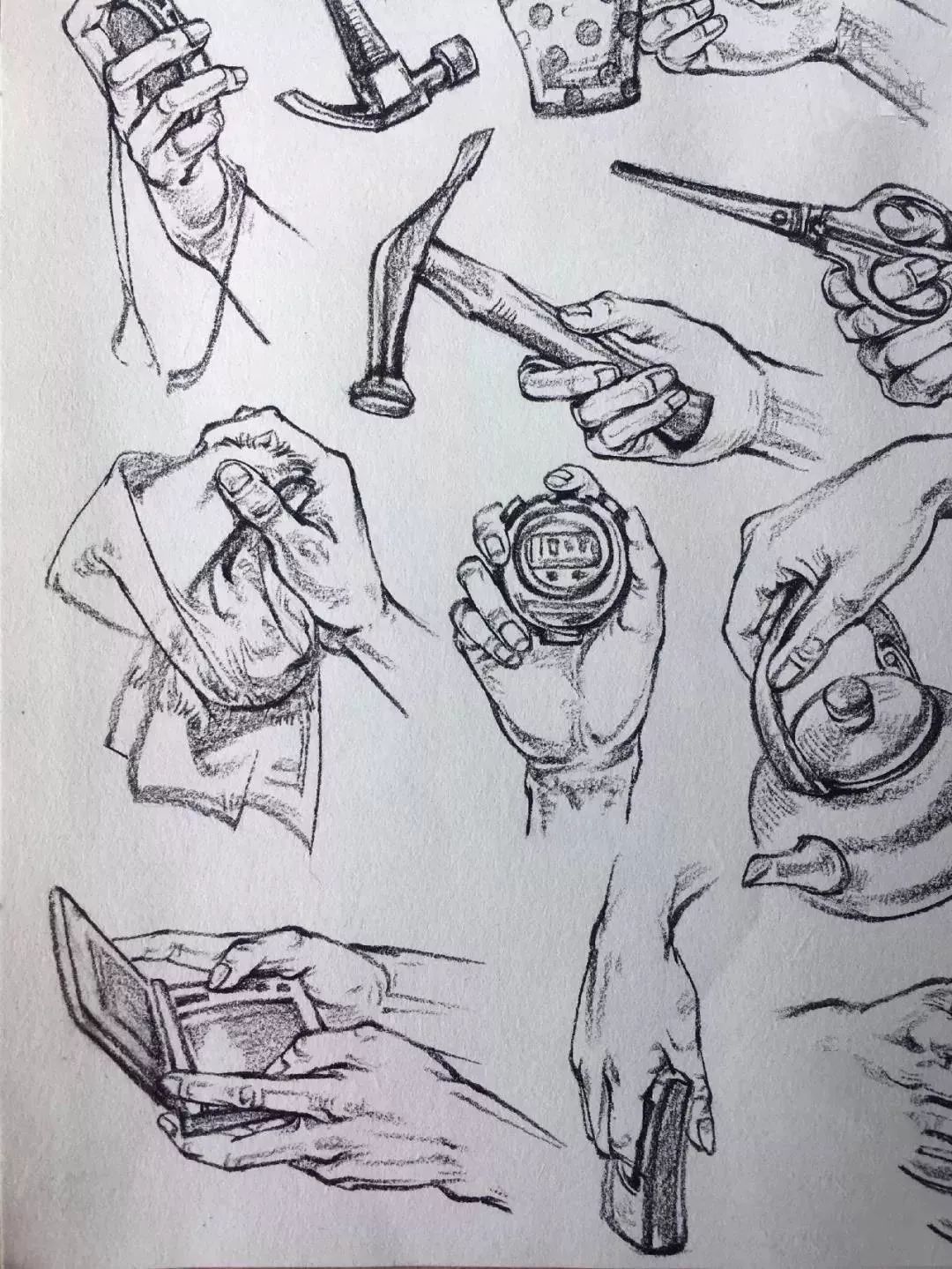 第一次分享教程,手部速写的教程非常不错 手部分解 三视图 画手步骤 ①用长线概括出手腕和手几大块的动态路线 ②分出手指的基本比例,找出每个指节相应的位置 ③每个关节的骨头点要重点刻画一下,适当用短线条表达出体积。 速写画手的练习素材 手在拿一些物体时的速写练习 |