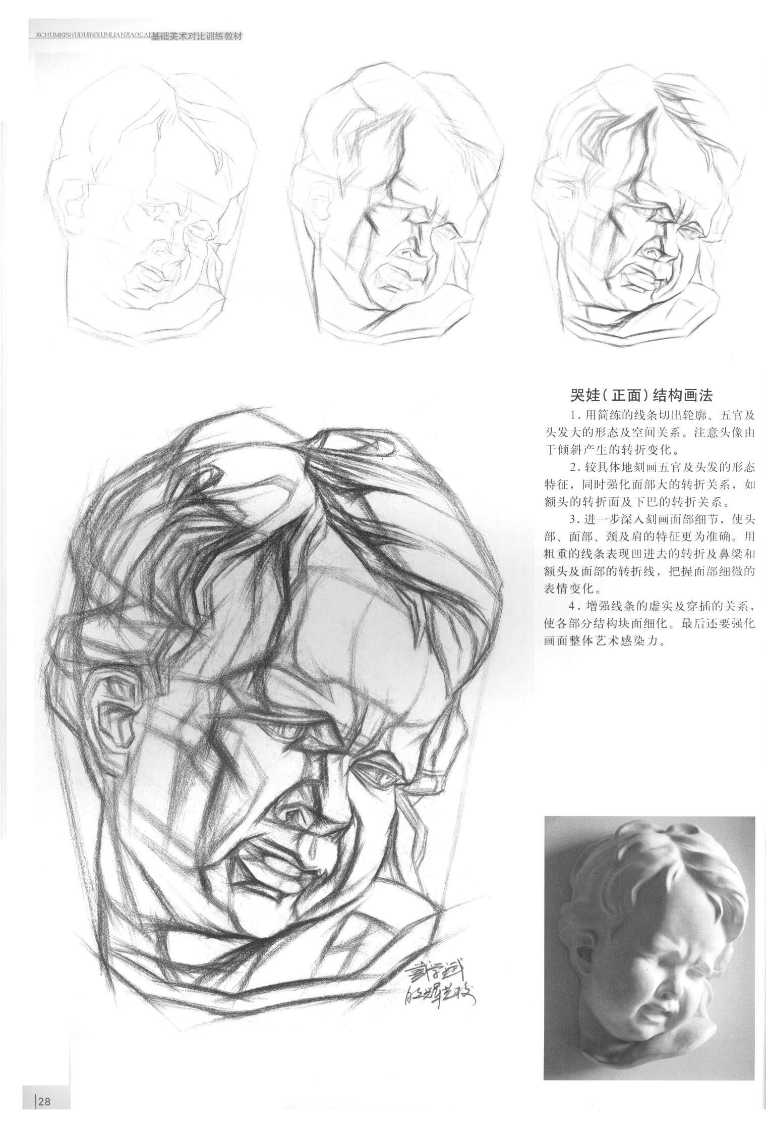 哭孩(正面)结构画法: 1. 用简练的线条切出轮廓、五官及头发大的形态及空间关系。注意头像由于倾斜产生的转折变化。 2. 较具体地刻画五官及头发的形态特征,同时强化面部大的转折关系,如额头的转折面及下巴的转折关系。 3. 进一步深入刻画面部细节,使头部、面部、颈及肩的特征更为准确。用粗重的线条表现凹进去的转折及鼻梁和额头及面部的转折线,把握面部细微的表情变化。 4. 增强线条的虚实及穿插的关系,使各部分结构块面细化。最后还要强化画面整体艺术感染力。 |